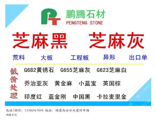 福建省鵬騰石業(yè)有限公司 本廠是一家集礦山開采,生產(chǎn)加工,工程訂單,進(jìn)出口貿(mào)易一體的綜合性企業(yè),距廈門港60KM,漳州火車站30KM,石井碼頭60KM(內(nèi)陸海運(yùn)),交通運(yùn)輸十分方便。 【金華石業(yè)】專門立足于本地豐富的自然資源,擁有成套先進(jìn)的石材設(shè)備,專業(yè)石材加工技術(shù)人員,掌握先進(jìn)的石材加工技術(shù),制定了一整套嚴(yán)格的質(zhì)量控制體系,品質(zhì)管理嚴(yán)格,專業(yè)生產(chǎn)本地石材:G654(芝麻黑),G655(芝麻灰),G682(黃銹石),G603(芝麻白),喬治亞灰,蝦紅、虎皮黃、毛光板,火燒板,踏步板,盲道板,機(jī)刨板,荔枝面,路沿石,蘑菇石,花壇石,花崗巖自然面,建筑用塊石,大型門牌石,墓碑石和橋柱橋欄,圓柱,等各種板材和弧形異型加工。 【鵬騰石業(yè)】專業(yè)加工出口超薄板材和超寬大板,并且在國內(nèi)外各大石材市場設(shè)有經(jīng)銷部和分公司,專業(yè)批發(fā)各種 大理石大板、花崗巖大板,并承接國內(nèi)外石材工程。 公司以“質(zhì)量,信譽(yù)”為宗旨,產(chǎn)品質(zhì)量可靠,價(jià)格優(yōu)惠,供貨及時(shí),有能力承接大數(shù)量的定單,是當(dāng)?shù)乜煽抗?yīng)商。竭誠歡迎國內(nèi)外廣大朋友來人來函洽談業(yè)務(wù),互相合作,共同發(fā)展。 電話:0596-8299871 傳真:0596-8267840 手機(jī):13306967840(微信) 網(wǎng)址:www.pengtengstone.com 地址:福建省長泰縣林墩工業(yè)區(qū)