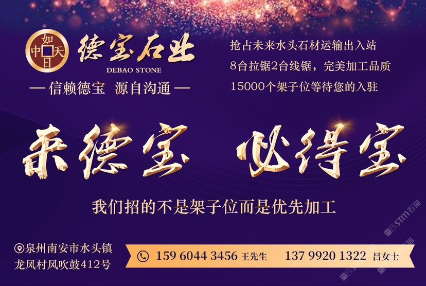 德寶大理石專業(yè)加工各規(guī)格大板,8臺(tái)拉鋸2臺(tái)線鋸,配備15000個(gè)架子位,是一家集加工、市場、展示為一體的二十多年老牌石企,嚴(yán)控出品質(zhì),歡迎來料加工!