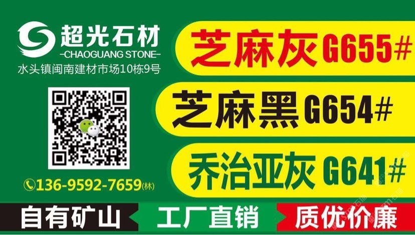 超光石材主營:654芝麻黑 、G641喬治亞灰 、655芝麻灰 、623芝麻白,大板批發(fā) 、規(guī)格光板、墓碑石 、火燒板、荔枝面、路沿石、菠蘿面、蘑菇石、荒料等各種石制品業(yè)務(wù)