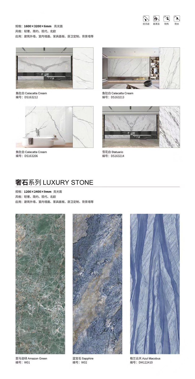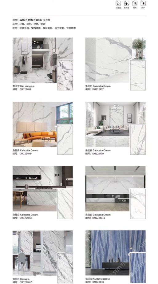 發(fā)布信息: ????SIBELAN 斯貝納巖板???? ????意大利設計師精選巖板???? 我們可以幫老總您加工為成品, 全國范圍內可安排專業(yè)團隊安裝. 做到您一次性采購 省心. 放心. 省時. 低價! 巖板紋路版面全多達199 款 勵志做服務五星的巖板專業(yè)供應商 魚肚白 雪花白 格蘭云天 寒江雪 爵士白 幻影灰 勞倫黑金 火山灰 亞馬遜 艾維拉 羅馬黑檀 貝特巖 細花白 羅馬灰 云朵拉灰 魚肚金 莎羅娜 莎羅蘭 勞倫白金 拉薩白 中花白 灰冰玉 卡拉拉白 撒金黑 清水玉 薩瓦灰 莎士比亞 大花灰 白冰玉 銀灰洞 阿瑪尼灰 綠紋玉 綠冰玉 藍紋玉 保加利亞灰 鐵銹 黑木紋 流砂灰 純白 純灰 純黑 TEL: 15905069590 聶 各種版面規(guī)格全部如下: 1200×600×11mm 啞光 1500×800×11mm 啞光 1800×900×11mm 啞光 1800×900×12mm 啞光 2600×800×15mm 啞光 2400×1200×6mm 啞光/亮光 2400×1200×9mm 啞光/亮光 2400×1200×15mm 啞光 2700×1200×6mm 啞光/亮光 2700×1600×12mm 啞光/亮光 3200×1600×6mm 啞光/亮光 3200×1600×12mm 啞光/亮光