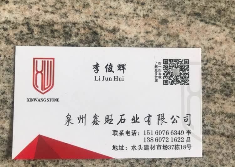 鑫旺石業(yè) 聯(lián)系人:李俊輝    151****6349 查看 手機(jī)號(hào)碼:無(wú) 主營(yíng)范圍: 大板批發(fā)、 企業(yè)地址:福建泉州南安市G324(福昆線)閩南建材第一市場(chǎng)
