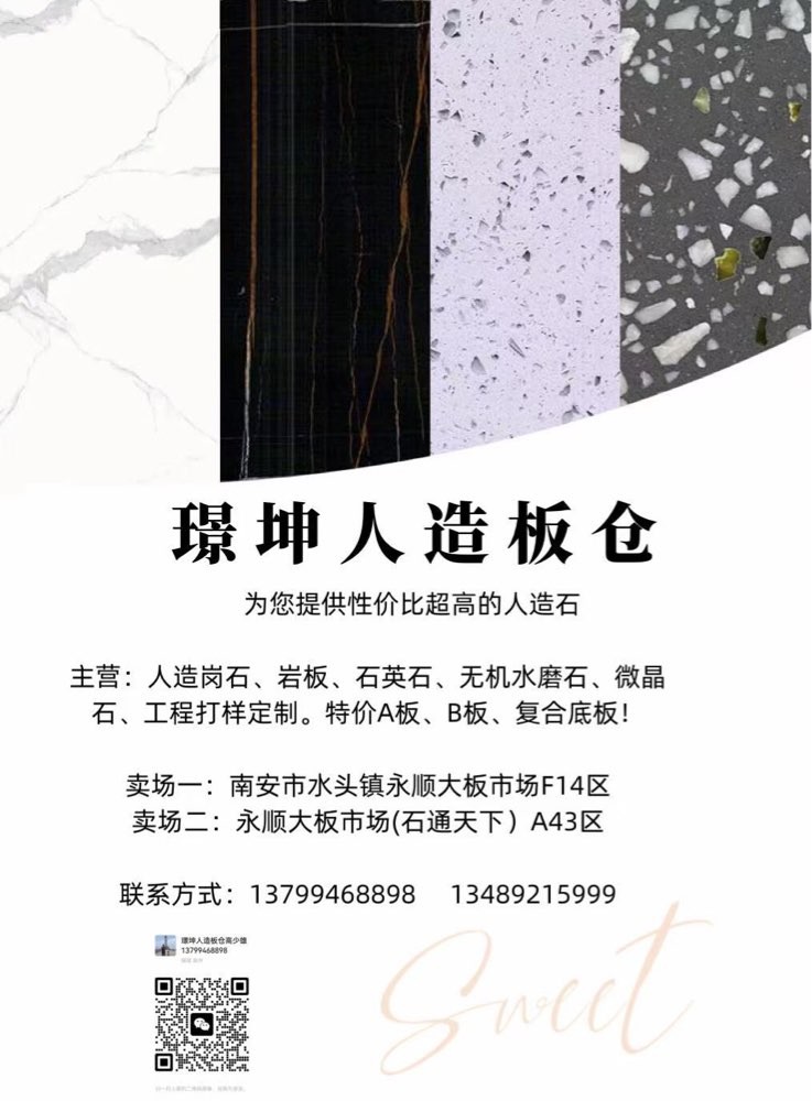 發(fā)布信息: 一璟坤人造板倉(cāng)一 主營(yíng):人造崗石,石英石,巖板,無機(jī)水磨石, 微晶石,工程打樣定制,特價(jià)A板,B板,復(fù)合底板 賣場(chǎng)地址:福建省南安市水頭鎮(zhèn)永順大板市場(chǎng)A43區(qū),F(xiàn)10一F14區(qū)。財(cái)富熱線:13799468898高先生