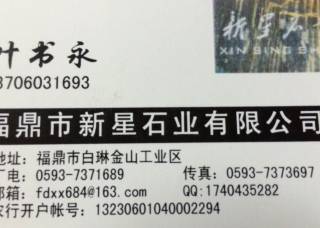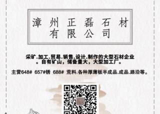 興安礦業(yè)主營產(chǎn)品:黃金麻3,黃金麻,沙漠棕1,沙漠棕(寶金石),山東銹石,木蘭紅,山水白,芝麻黑654,銹石,黃銹石,石井銹石(荔枝面),青石,青石(荔枝面),山水木紋綠(荔枝面),山水木紋綠(水沖面),山水巖(山東),萬源青,泉州紅,G655,龍柱企業(yè)地址:福建泉州水頭鎮(zhèn)福山工業(yè)區(qū)三期新環(huán)球往白蓮寺方向一公里。